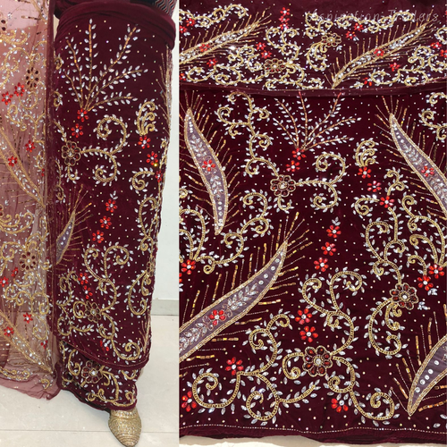 Bright Maroon Heavy Stone Beaded Velvet Fabric Nigerian George Wrapper Set - VG082
