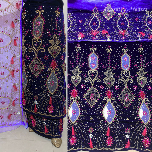 Smoky Royal Blue Trending Beaded Design On Velvet Fabric Nigerian George Wrapper Set - VG078