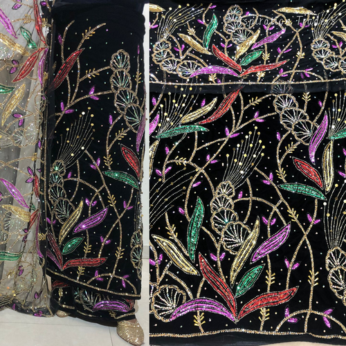 Iconic Black Crystal Stone Beaded Designer Velvet Fabric Nigerian George Wrapper Set - VG084