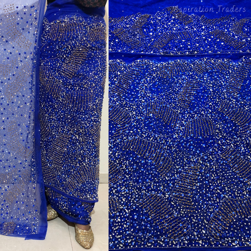 Royal Blue Heavy crystal stone beaded Net Lace George Wrapper Set with Blouse - NLDG323