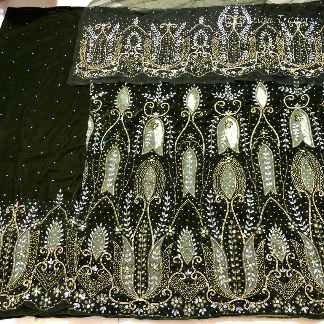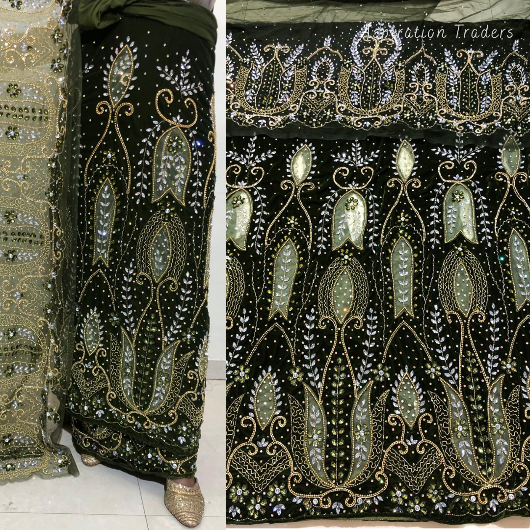 Olive Green Heavy Stone Beaded Designer Velvet Fabric George Wrapper Set - VG088
