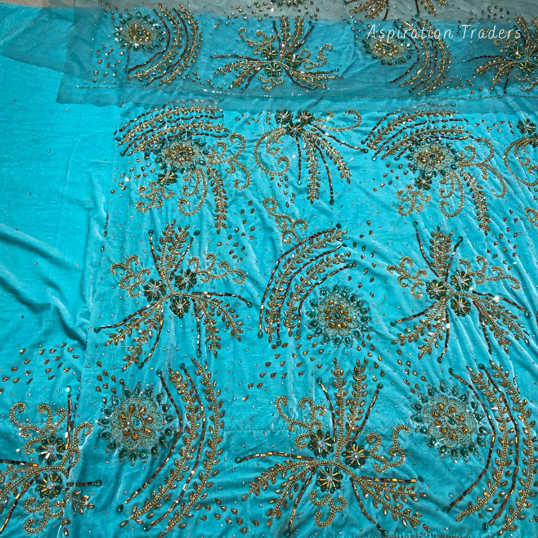 Sober Sky Blue Crystal Stone Beaded Designer Velvet Fabric George Wrapper Set - VG087