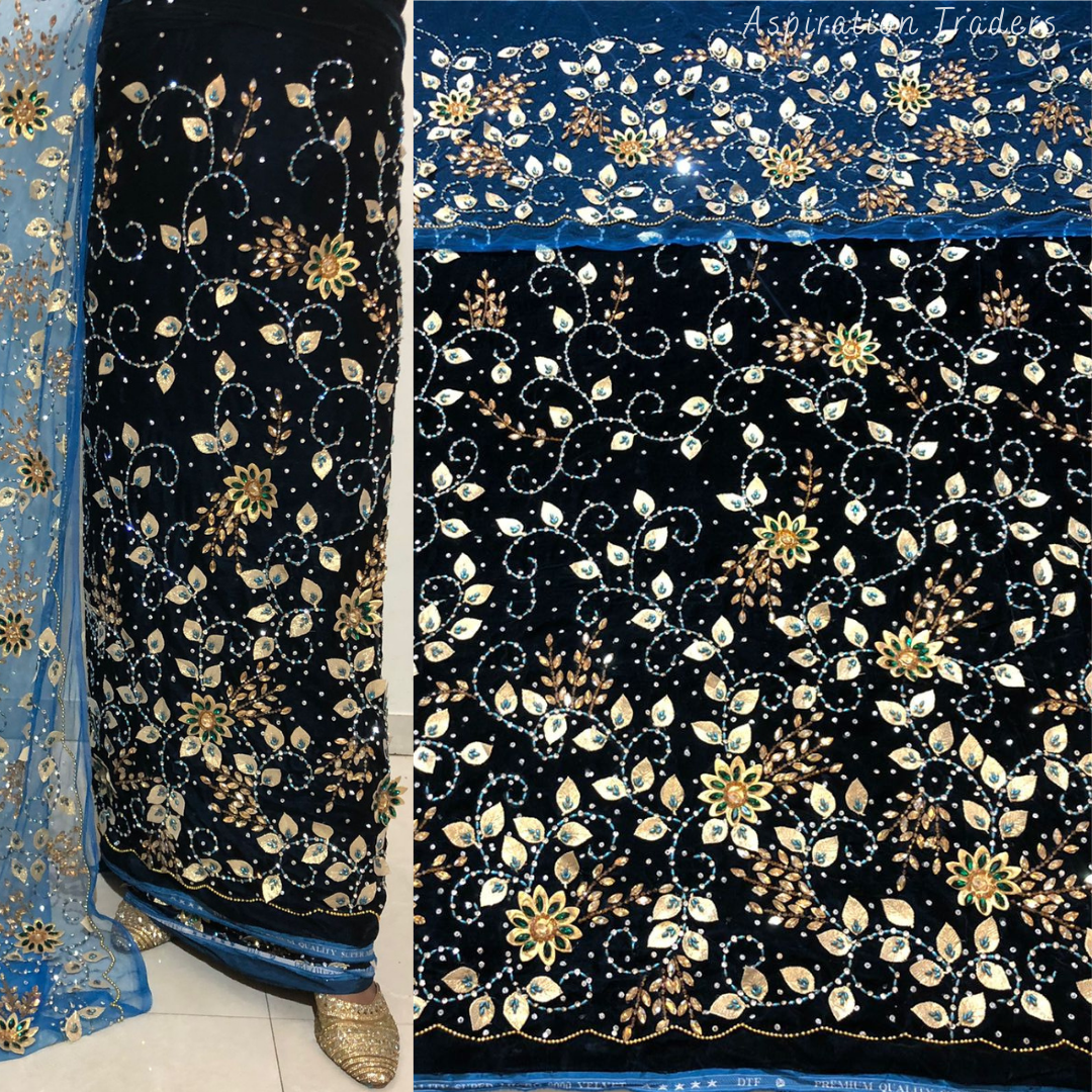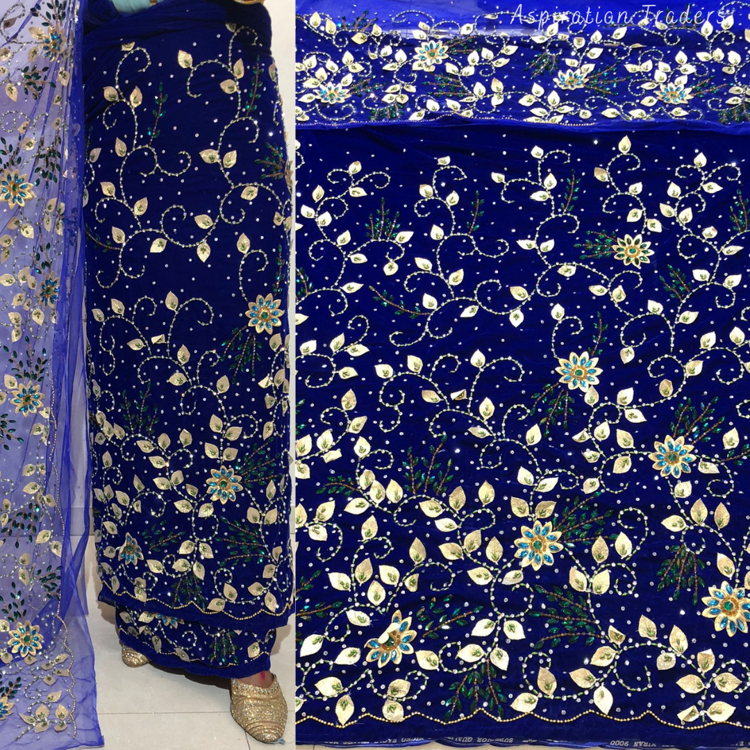 Turquoise Blue crystal stone Beaded Designer Velvet Fabric George Set - VG092