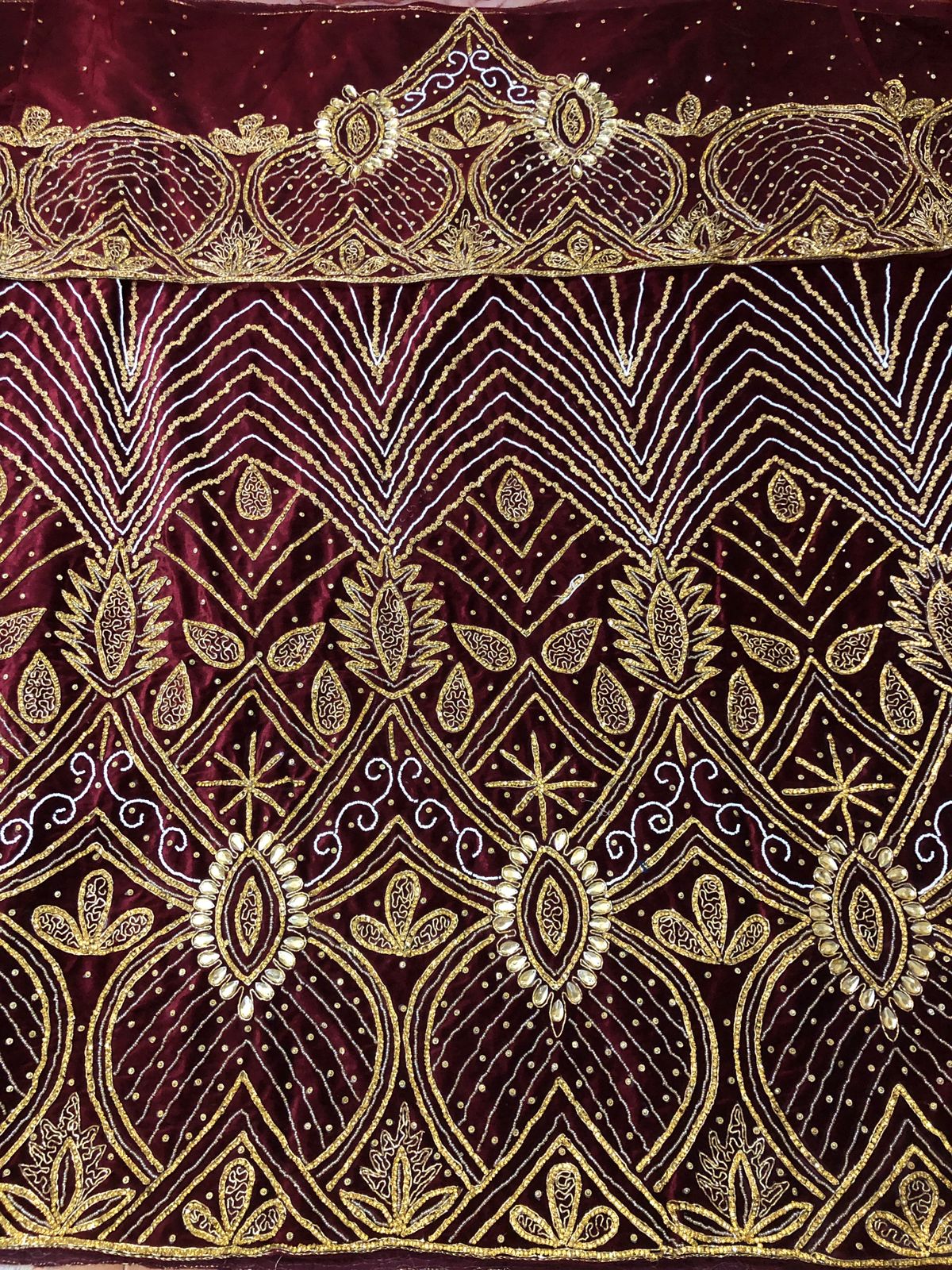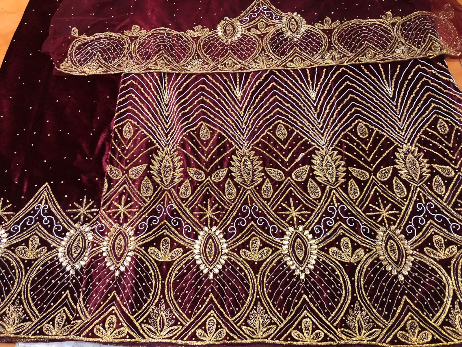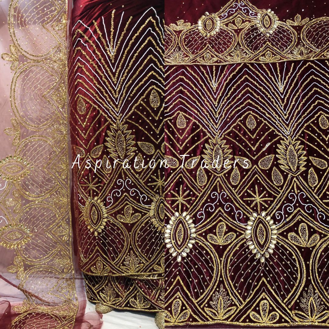 • African High-Quality velvet lace fabric with lots of Stones Work, Pearl Work, and Cut Work. Fabrics like this are popular for creating stunning evening gowns, couture dresses, drapery, and other high-fashion items due to their unique and eye-catching appearance.